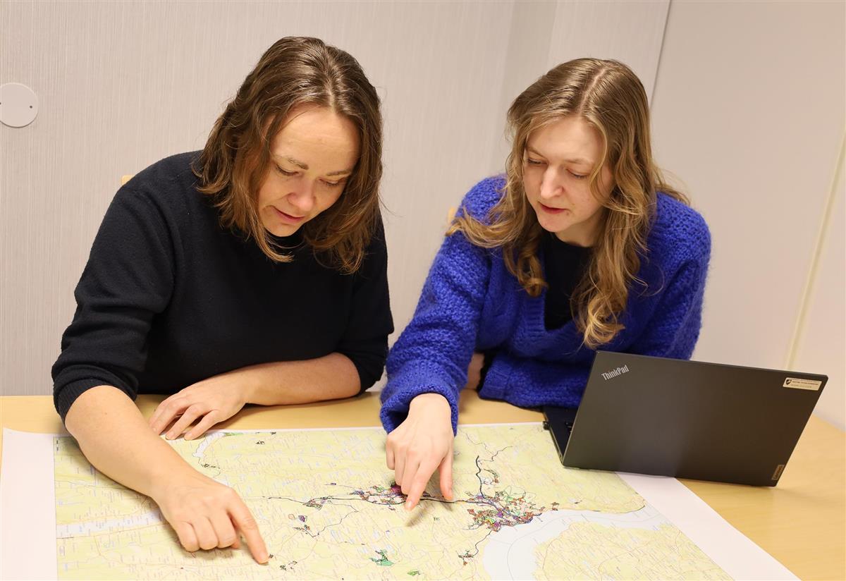 Kunnskapsdeling pågår: Byggesaksbehandler Rita Vesteng (til venstre) og byarkitekt Silje Ekornrud Seim.