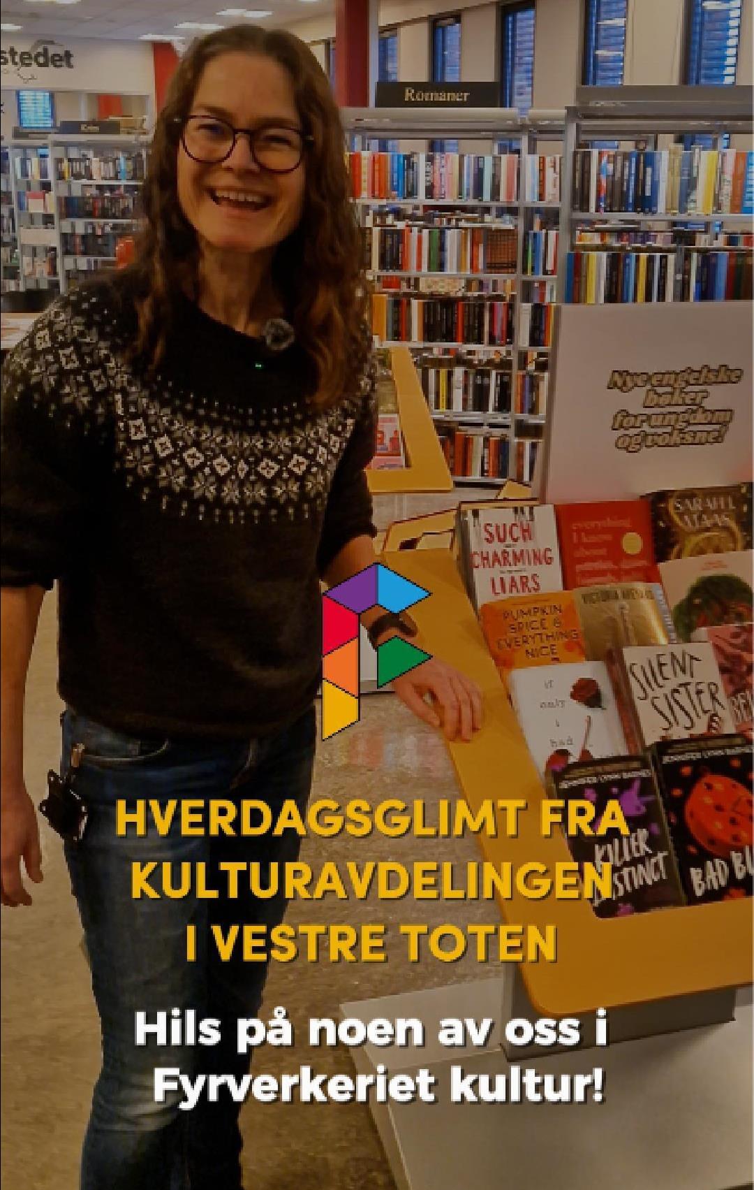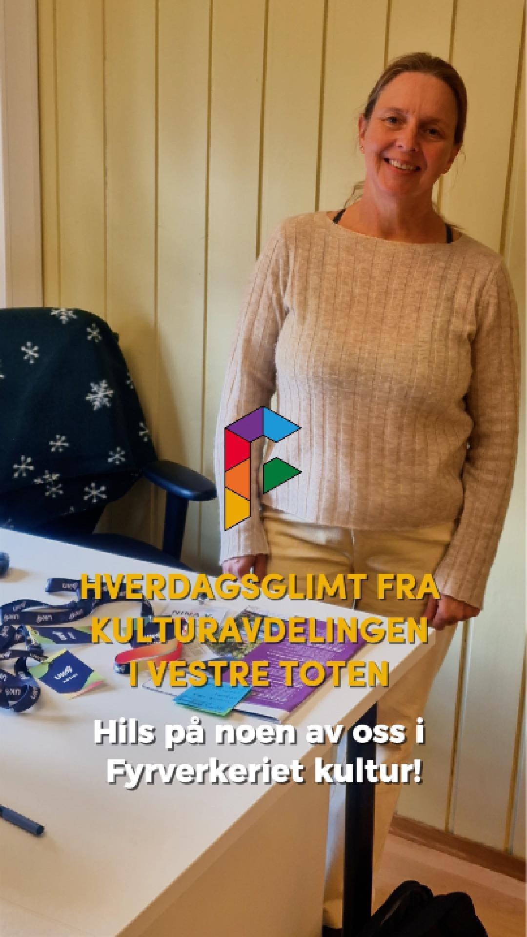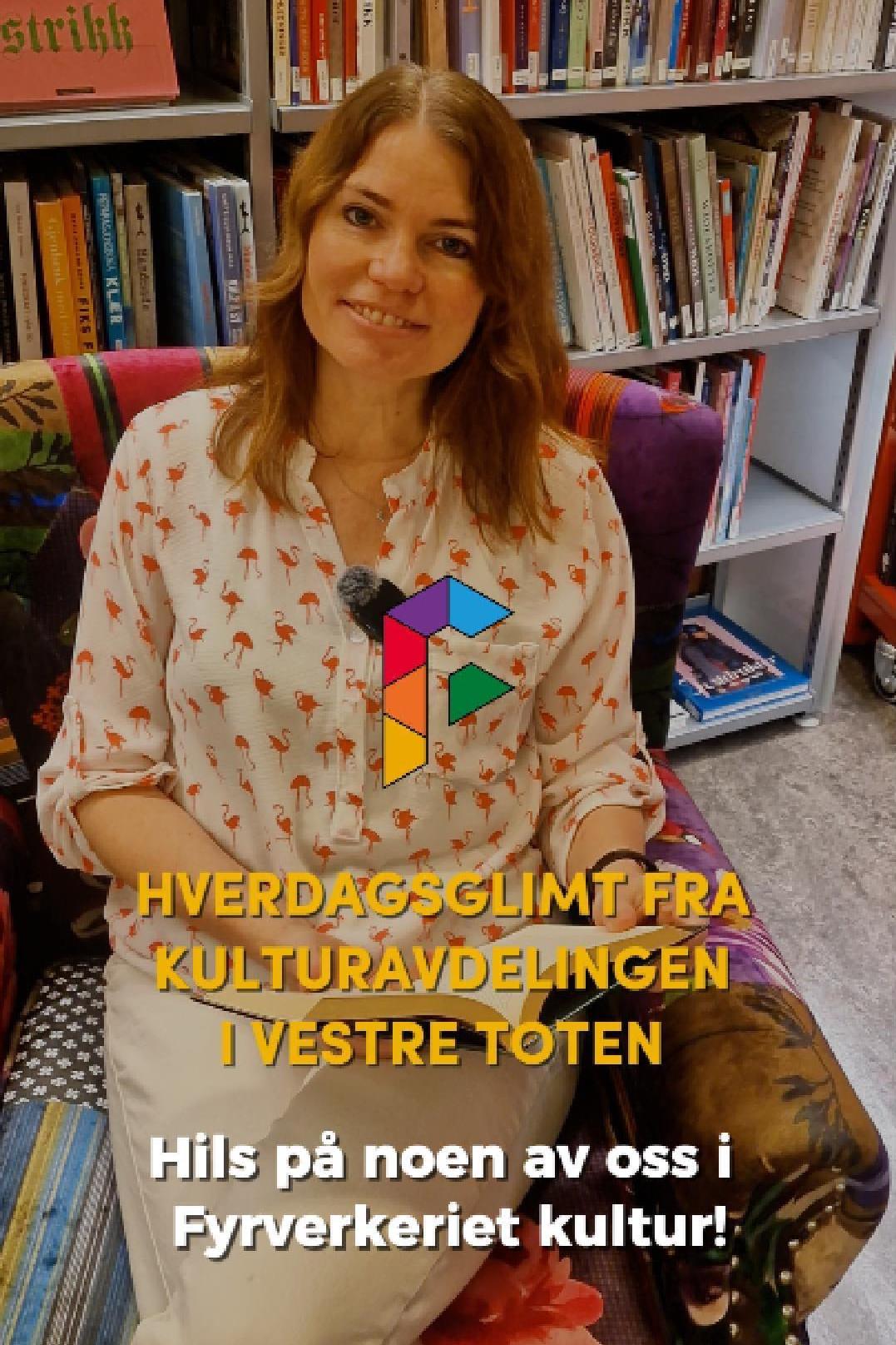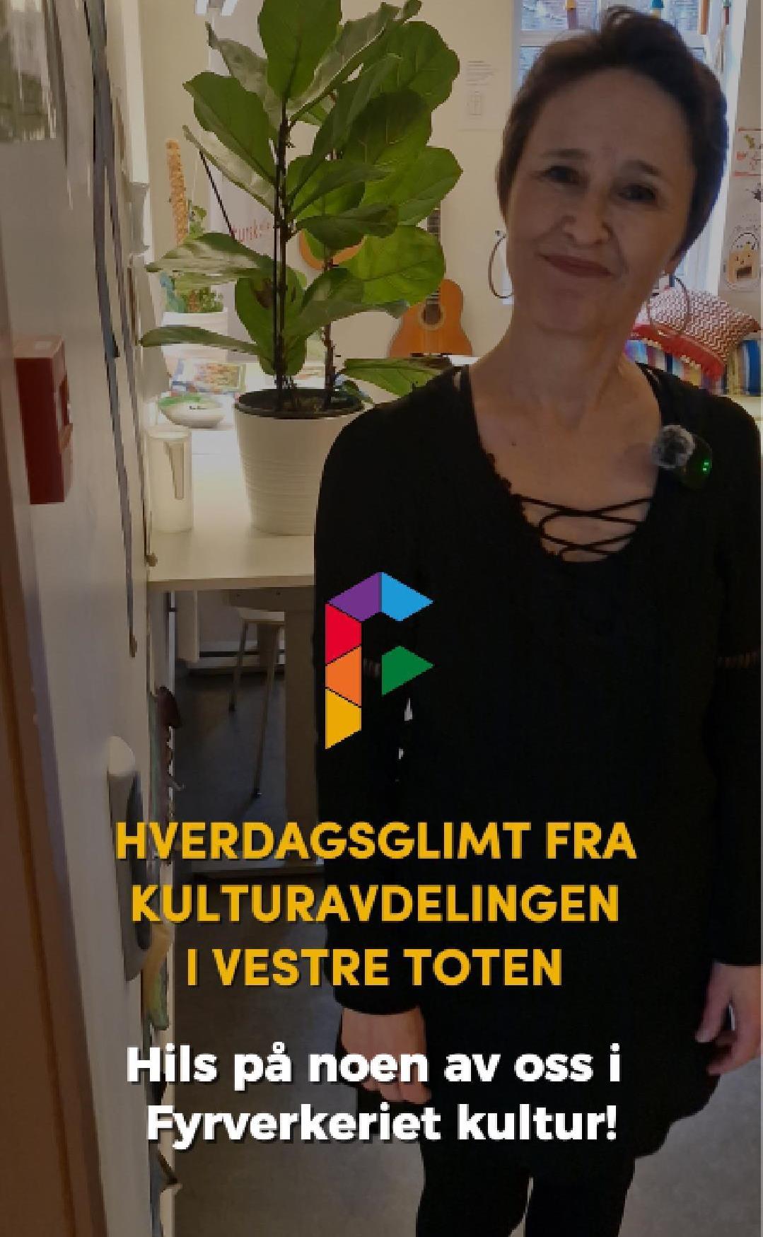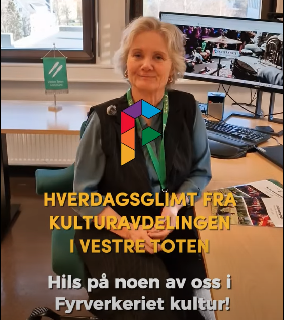 HverdagsglimtI 2024/2025 ble mange av de ansatte i kulturavdelingen i Vestre Toten intervjuet om sin hverdag og hvorfor de mener kulturfeltet er viktig. Lenker til videoer ligger i teksten tilhørende bilde.Se videointervju av kulursjefen Elisabeth Lund og hennes hverdag! Se videointervju av Hilde Leonardsen og hennes hverdag som leder på Fyrverkeriet ungdomshus! Se videointervju av Mona Myrland og hennes hverdag som leder på Fyrverkeriet bibliotek! Se videointervju av Nina Nedberg og hennes hverdag som leder på Fyrverkeriet bibliotek! Se videointervju av Anne Linn Dambråten og hennes hverdag med å tilrettelegge for aktiviteter for voksne! Se videointervju av Geir Sollie og hans hverdag som rådgiver innen idrett og friluftsliv! Se videointervju av Hilde Skogli og hennes hverdag som koordinator for SLT og støttekontakttjenesten! Se videointervju av Tommy Svendsen og hans hverdag som aktivitetskontakt!Se videointervju av Benedikte Narum og hennes hverdag som fagleder og teaterlærer på Fyrverkeriet kulturskole!Fyrverkeriet kultur – BenedikteSe videointervju av Maria Nyheim og hennes hverdag med ansvar for kommunikasjon og design! Se videointervju av Mia Ruud og hennes hverdag på Fyrverkeriet bibliotek i arbeid med barn og ungdom! Se videointervju av Line Horntveth og hennes hverdag på Fyrverkeriet kulturskole med småtrølltræff og ute og sprer kulturglede i omsorgsboliger og skoler!Se videointervju av Nina Vedal og hennes hverdag på Fyrverkeriet ungdomshus!Se videointervju av Sigurd Skogum Riise og hans hverdag som pianolærer på Fyrverkeriet kulturskole!Se videointervju av Ingvill Solberg og hennes hverdag på Fyrverkeriet bibliotek!Fyrverkeriet kultur – IngvillSe videointervju av Leif-Kristian Tøftum og hans hverdag på Fyrverkeriet bibliotek og verkstedet der!Se videointervju av Jelena Markovic og hennes hverdag på Fyrverkeriet kulturskole og ungdomshus!Fyrverkeriet kultur – JelenaSe videointervju av Ståle Strandeng og hans hverdag på Fyrverkeriet bibliotek og ungdomshus!Se videointervju av Pooneh Ronagh og hennes hverdag som kunstlærer på Fyrverkeriet kulturskole!Se videointervju av Espen Glæserud og hans hverdag på Fyrverkeriet ungdomshus!Fyrverkeriet kultur – EspenSe videointervju av Marieke Bettman og hennes hverdag som fiolinlærer på Fyrverkeriet kulturskole!Fyrverkeriet kultur – MariekeSe videointervju av Beate Karita Engeli og hennes hverdag på juniorklubben og ungdomsklubben!Se videointervju av Erik Wang og hans hverdag på kulturskolen!Se videointervju av Alexander Bryntesen og hans hverdag på ungdomsklubben!Se videointervju av Torhild Haug og hennes hverdag på Fyrverkeriet kulturhus!