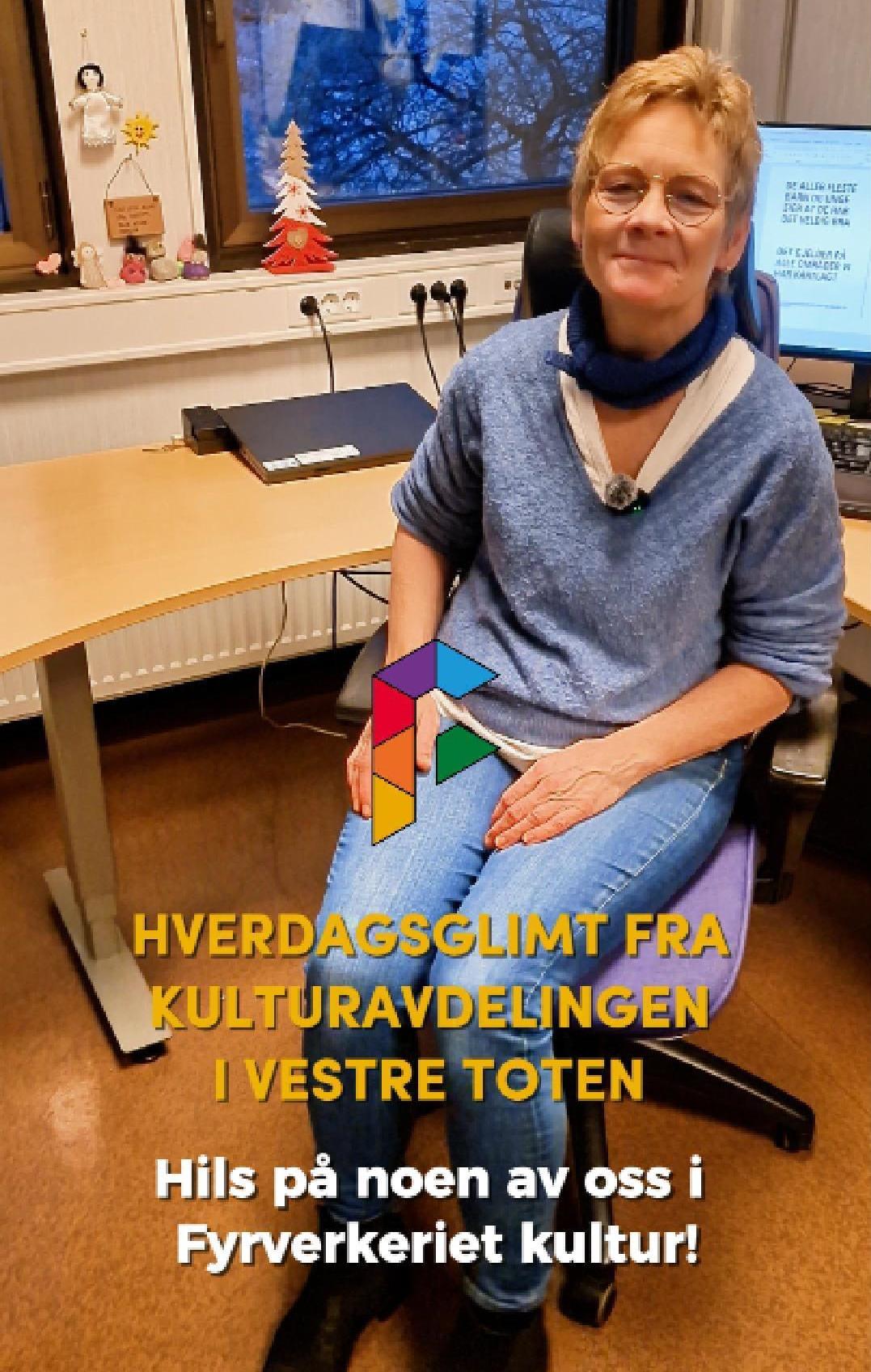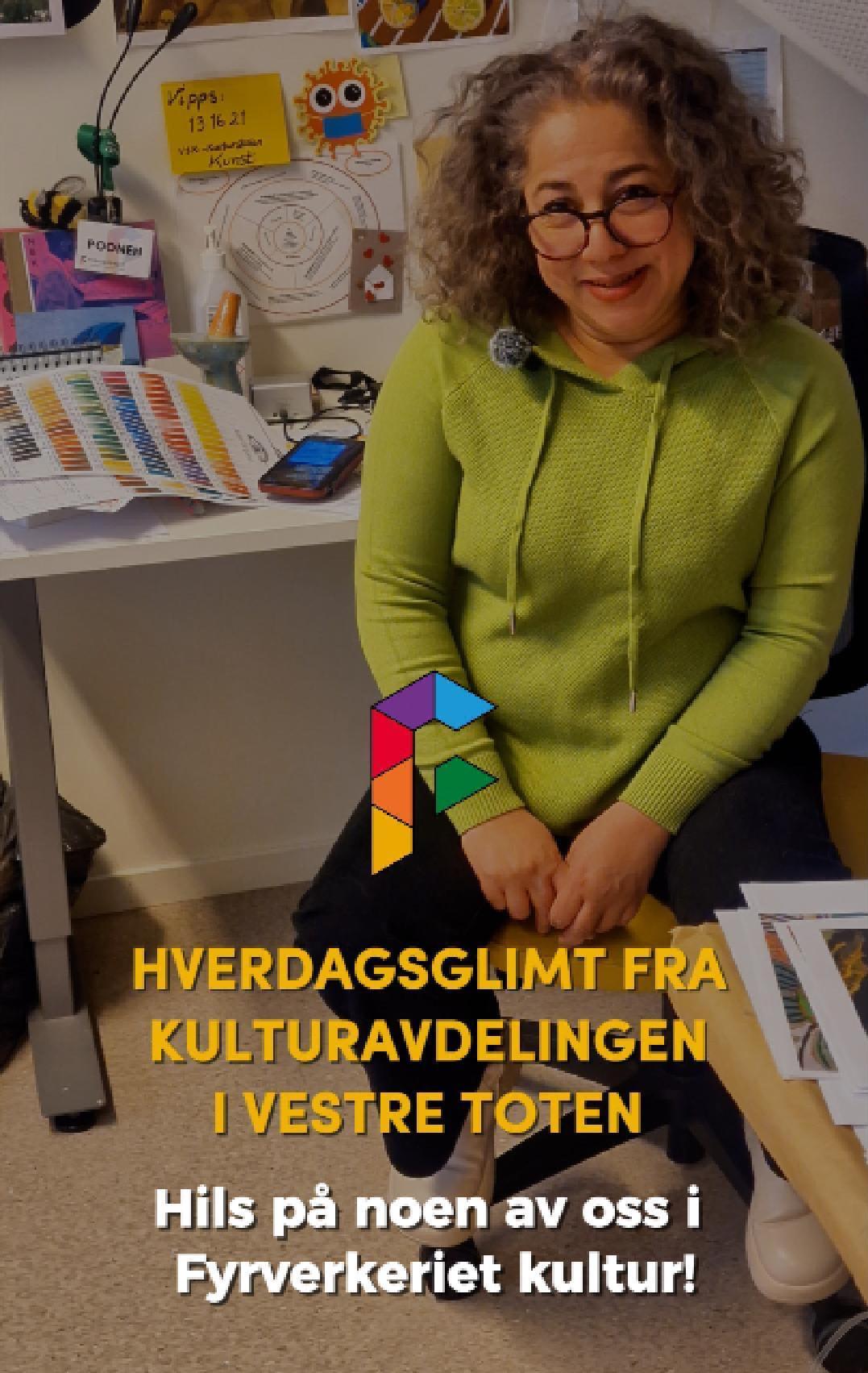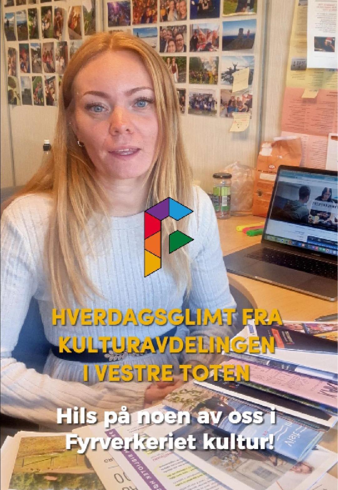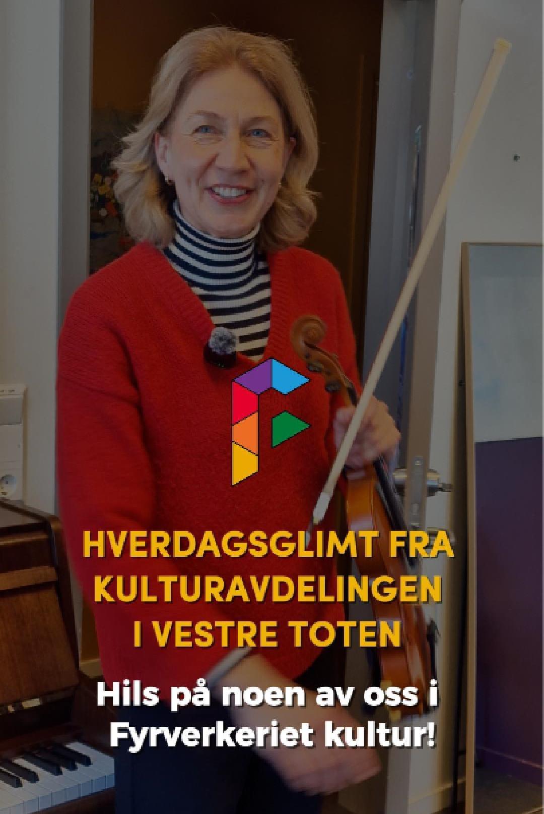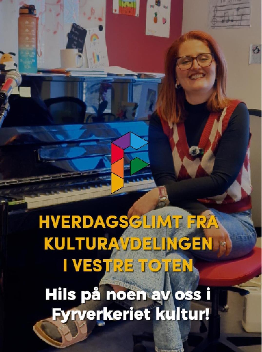 HverdagsglimtI 2024/2025 ble mange av de ansatte i kulturavdelingen i Vestre Toten intervjuet om sin hverdag og hvorfor de mener kulturfeltet er viktig. Lenker til videoer ligger i teksten tilhørende bilde.Se videointervju av kulursjefen Elisabeth Lund og hennes hverdag! Se videointervju av Hilde Leonardsen og hennes hverdag som leder på Fyrverkeriet ungdomshus! Se videointervju av Mona Myrland og hennes hverdag som leder på Fyrverkeriet bibliotek! Se videointervju av Nina Nedberg og hennes hverdag som leder på Fyrverkeriet bibliotek! Se videointervju av Anne Linn Dambråten og hennes hverdag med å tilrettelegge for aktiviteter for voksne! Se videointervju av Geir Sollie og hans hverdag som rådgiver innen idrett og friluftsliv! Se videointervju av Hilde Skogli og hennes hverdag som koordinator for SLT og støttekontakttjenesten! Se videointervju av Tommy Svendsen og hans hverdag som aktivitetskontakt!Se videointervju av Benedikte Narum og hennes hverdag som fagleder og teaterlærer på Fyrverkeriet kulturskole!Fyrverkeriet kultur – BenedikteSe videointervju av Maria Nyheim og hennes hverdag med ansvar for kommunikasjon og design! Se videointervju av Mia Ruud og hennes hverdag på Fyrverkeriet bibliotek i arbeid med barn og ungdom! Se videointervju av Line Horntveth og hennes hverdag på Fyrverkeriet kulturskole med småtrølltræff og ute og sprer kulturglede i omsorgsboliger og skoler!Se videointervju av Nina Vedal og hennes hverdag på Fyrverkeriet ungdomshus!Se videointervju av Sigurd Skogum Riise og hans hverdag som pianolærer på Fyrverkeriet kulturskole!Se videointervju av Ingvill Solberg og hennes hverdag på Fyrverkeriet bibliotek!Fyrverkeriet kultur – IngvillSe videointervju av Leif-Kristian Tøftum og hans hverdag på Fyrverkeriet bibliotek og verkstedet der!Se videointervju av Jelena Markovic og hennes hverdag på Fyrverkeriet kulturskole og ungdomshus!Fyrverkeriet kultur – JelenaSe videointervju av Ståle Strandeng og hans hverdag på Fyrverkeriet bibliotek og ungdomshus!Se videointervju av Pooneh Ronagh og hennes hverdag som kunstlærer på Fyrverkeriet kulturskole!Se videointervju av Espen Glæserud og hans hverdag på Fyrverkeriet ungdomshus!Fyrverkeriet kultur – EspenSe videointervju av Marieke Bettman og hennes hverdag som fiolinlærer på Fyrverkeriet kulturskole!Fyrverkeriet kultur – MariekeSe videointervju av Beate Karita Engeli og hennes hverdag på juniorklubben og ungdomsklubben!Se videointervju av Erik Wang og hans hverdag på kulturskolen!Se videointervju av Alexander Bryntesen og hans hverdag på ungdomsklubben!Se videointervju av Torhild Haug og hennes hverdag på Fyrverkeriet kulturhus!