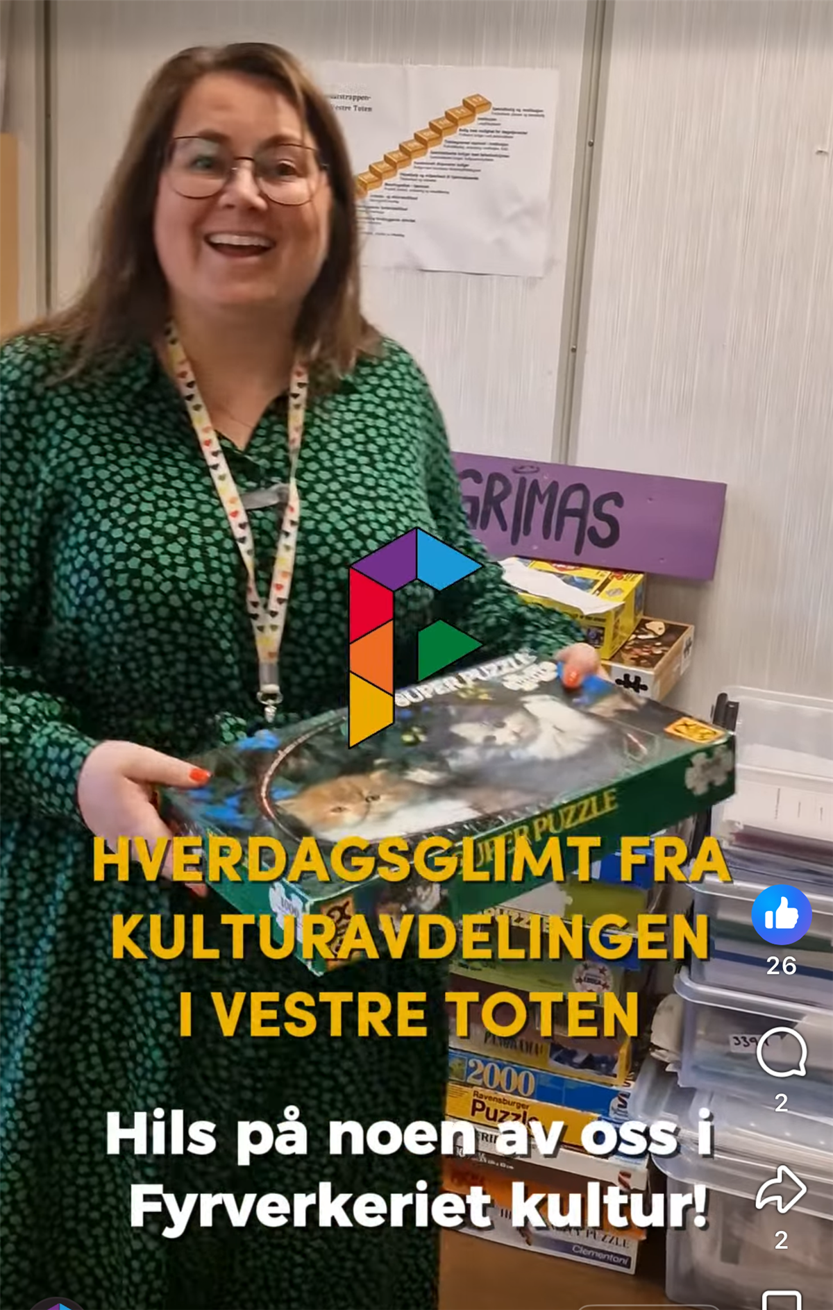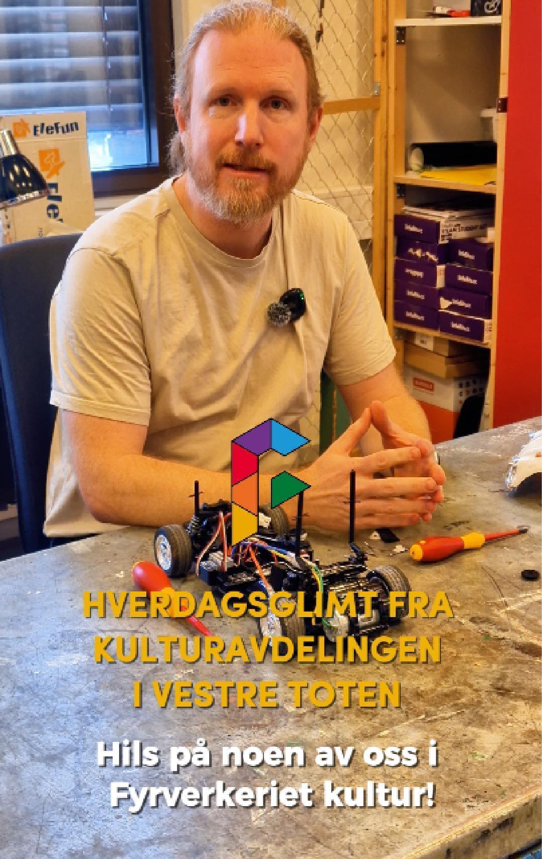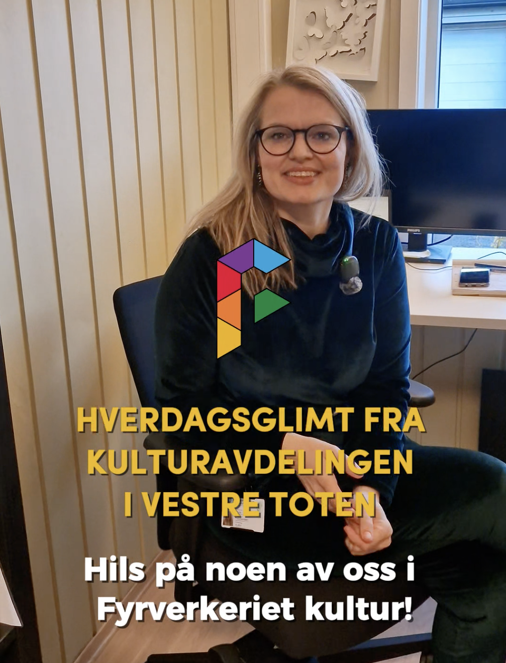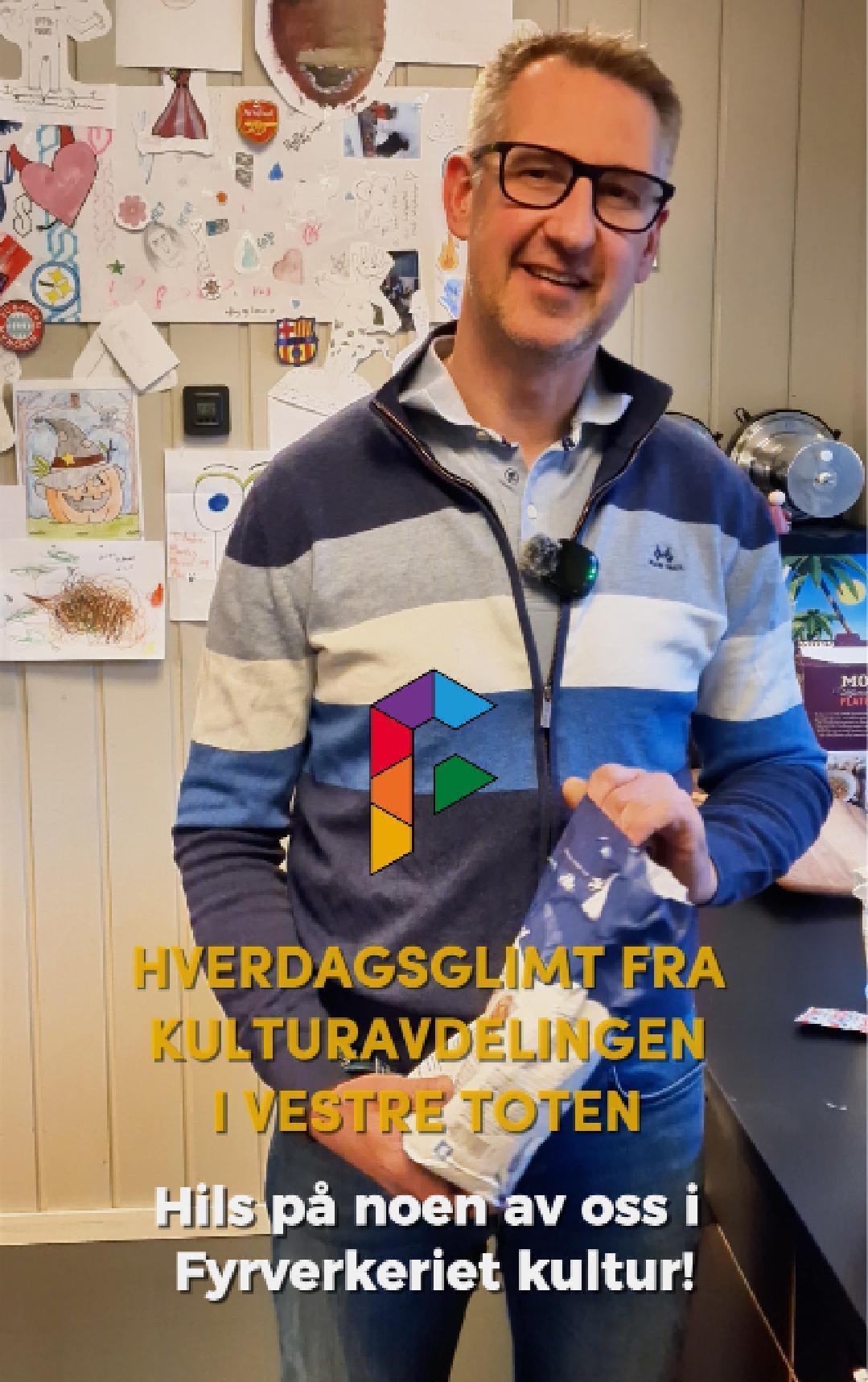 HverdagsglimtI 2024/2025 ble mange av de ansatte i kulturavdelingen i Vestre Toten intervjuet om sin hverdag og hvorfor de mener kulturfeltet er viktig. Lenker til videoer ligger i teksten tilhørende bilde.Se videointervju av kulursjefen Elisabeth Lund og hennes hverdag! Se videointervju av Hilde Leonardsen og hennes hverdag som leder på Fyrverkeriet ungdomshus! Se videointervju av Mona Myrland og hennes hverdag som leder på Fyrverkeriet bibliotek! Se videointervju av Nina Nedberg og hennes hverdag som leder på Fyrverkeriet bibliotek! Se videointervju av Anne Linn Dambråten og hennes hverdag med å tilrettelegge for aktiviteter for voksne! Se videointervju av Geir Sollie og hans hverdag som rådgiver innen idrett og friluftsliv! Se videointervju av Hilde Skogli og hennes hverdag som koordinator for SLT og støttekontakttjenesten! Se videointervju av Tommy Svendsen og hans hverdag som aktivitetskontakt!Se videointervju av Benedikte Narum og hennes hverdag som fagleder og teaterlærer på Fyrverkeriet kulturskole!Fyrverkeriet kultur – BenedikteSe videointervju av Maria Nyheim og hennes hverdag med ansvar for kommunikasjon og design! Se videointervju av Mia Ruud og hennes hverdag på Fyrverkeriet bibliotek i arbeid med barn og ungdom! Se videointervju av Line Horntveth og hennes hverdag på Fyrverkeriet kulturskole med småtrølltræff og ute og sprer kulturglede i omsorgsboliger og skoler!Se videointervju av Nina Vedal og hennes hverdag på Fyrverkeriet ungdomshus!Se videointervju av Sigurd Skogum Riise og hans hverdag som pianolærer på Fyrverkeriet kulturskole!Se videointervju av Ingvill Solberg og hennes hverdag på Fyrverkeriet bibliotek!Fyrverkeriet kultur – IngvillSe videointervju av Leif-Kristian Tøftum og hans hverdag på Fyrverkeriet bibliotek og verkstedet der!Se videointervju av Jelena Markovic og hennes hverdag på Fyrverkeriet kulturskole og ungdomshus!Fyrverkeriet kultur – JelenaSe videointervju av Ståle Strandeng og hans hverdag på Fyrverkeriet bibliotek og ungdomshus!Se videointervju av Pooneh Ronagh og hennes hverdag som kunstlærer på Fyrverkeriet kulturskole!Se videointervju av Espen Glæserud og hans hverdag på Fyrverkeriet ungdomshus!Fyrverkeriet kultur – EspenSe videointervju av Marieke Bettman og hennes hverdag som fiolinlærer på Fyrverkeriet kulturskole!Fyrverkeriet kultur – MariekeSe videointervju av Beate Karita Engeli og hennes hverdag på juniorklubben og ungdomsklubben!Se videointervju av Erik Wang og hans hverdag på kulturskolen!Se videointervju av Alexander Bryntesen og hans hverdag på ungdomsklubben!Se videointervju av Torhild Haug og hennes hverdag på Fyrverkeriet kulturhus!