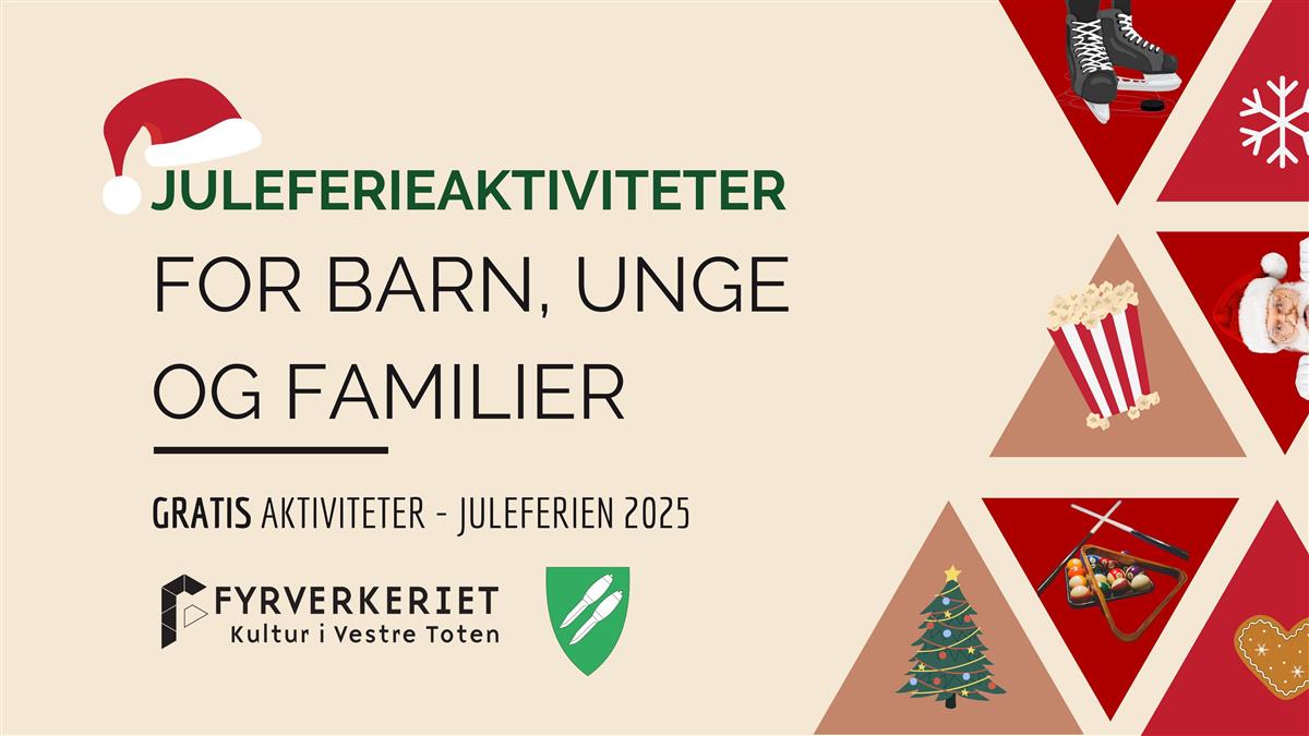 FerietilbudHver ferie i skoleruta fylles hvert år med gratis aktiviteter for barn, unge og familier her i Vestre Toten kommune! PDf-ene er klikkbare, så klikk på arrangementet du vil delta på for å lese mer eller melde deg på!Juleferieprogram 2025 barn, unge og familierVestre Toten kommune sitt program for gratis aktiviteter i juleferien for barn, ungdom og familier finner du her: Juleferie 2025 gratis aktiviteter barn.pdf (PDF, 6 MB)Juleferie 2025 gratis aktiviteter ungdom.pdf (PDF, 18 MB)