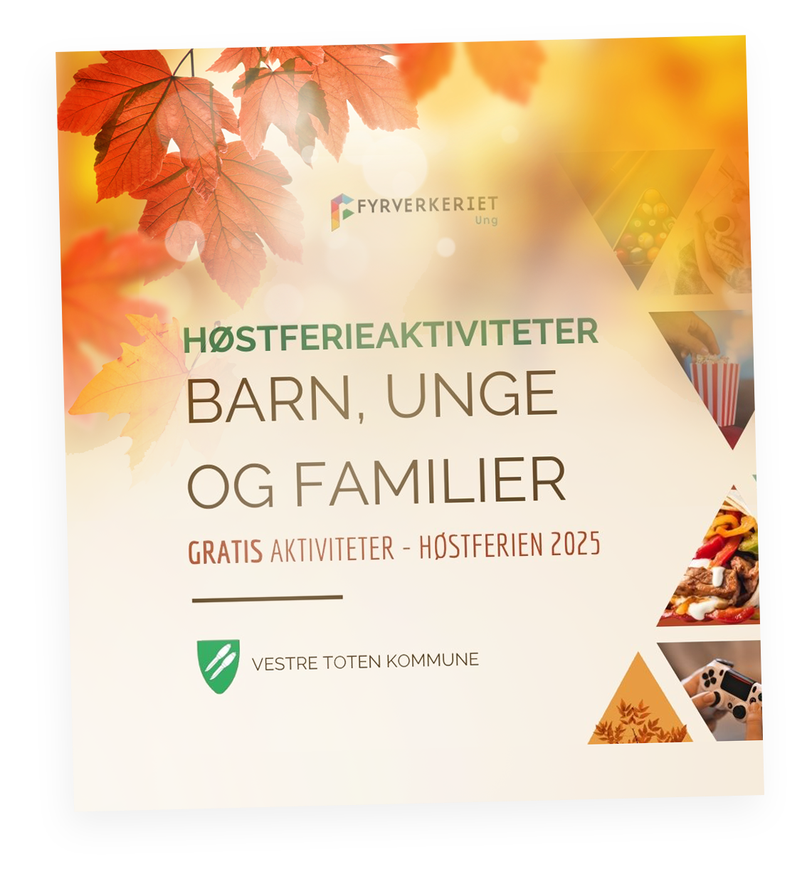 FerietilbudHver ferie i skoleruta fylles hvert år med gratis aktiviteter for barn, unge og familier her i Vestre Toten kommune!Høstferieaktiviteter for barn, unge og familier i Vestre Toten kommuneVestre Toten kommune sitt program for gratis aktiviteter i høstferien for barn, ungdom og familier finner du her: Høstferieaktiviteter for barn, unge og familier Vi kan også anbefale å sjekk ut: Camp Osbakken - høstferien - for ungdom 12-15 år